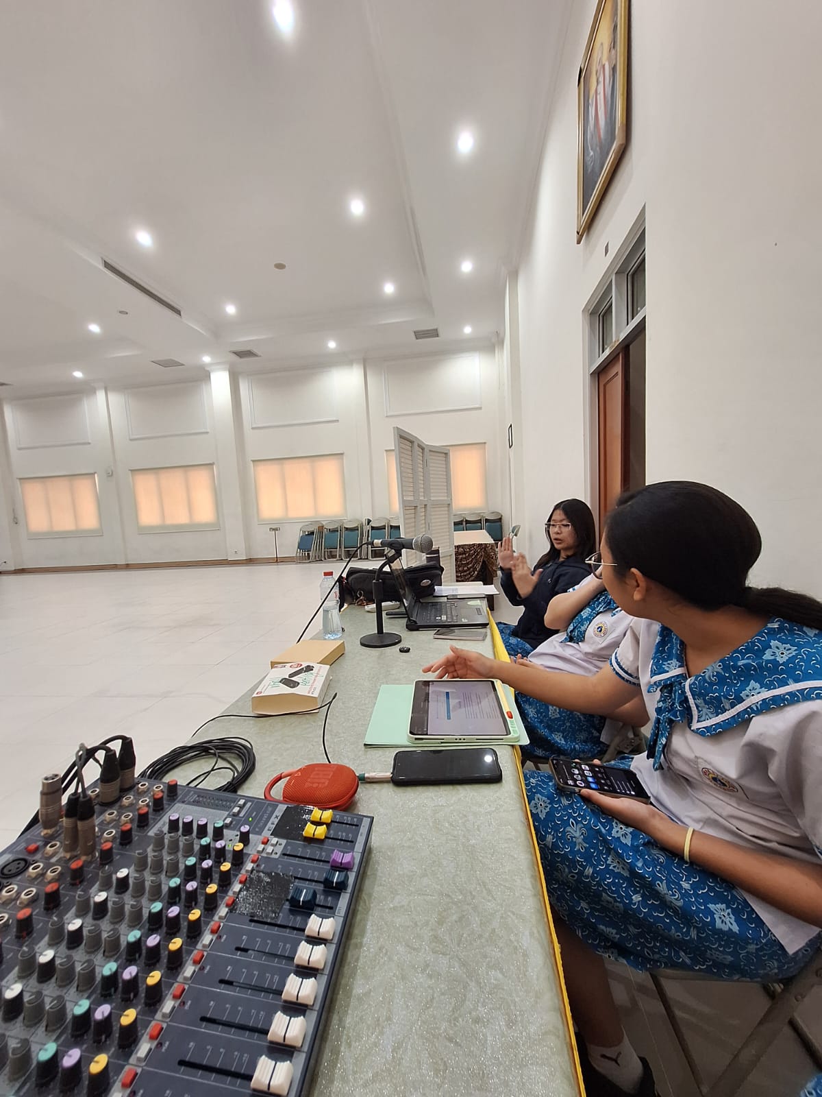 Latihan Uprak di Bangsal LazarisSelain mengurus dekorasi, saya juga bertanggung jawab mengatur background untuk penampilan kelas kita menggunakan OBS. Saya harus menampilkan background sesuai adegan sekaligus memutar musik pada waktu yang tepat. Awalnya saya mengalami kesulitan karena belum pernah menggunakan OBS sebelumnya. Saya juga kesulitan mencari background yang cocok, terutama karena beberapa adegan membutuhkan suasana Indonesia zaman dahulu. Setelah berkonsultasi dengan pustekom, saya mulai memahami cara mengganti tampilan dan menampilkan background di LCDnya. Saya juga mempelajari penggunaan plugin soundboard agar musik dapat diputar langsung dari OBS secara terpisah dan lebih rapi.